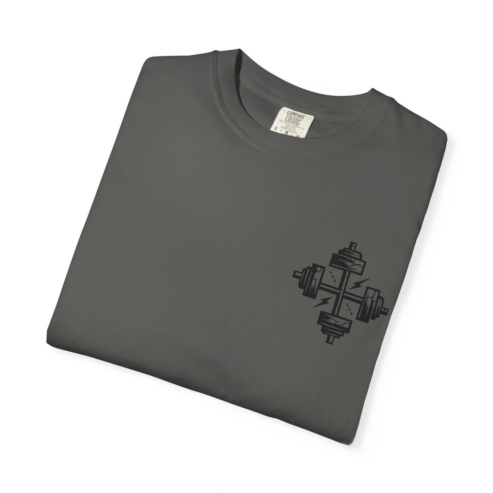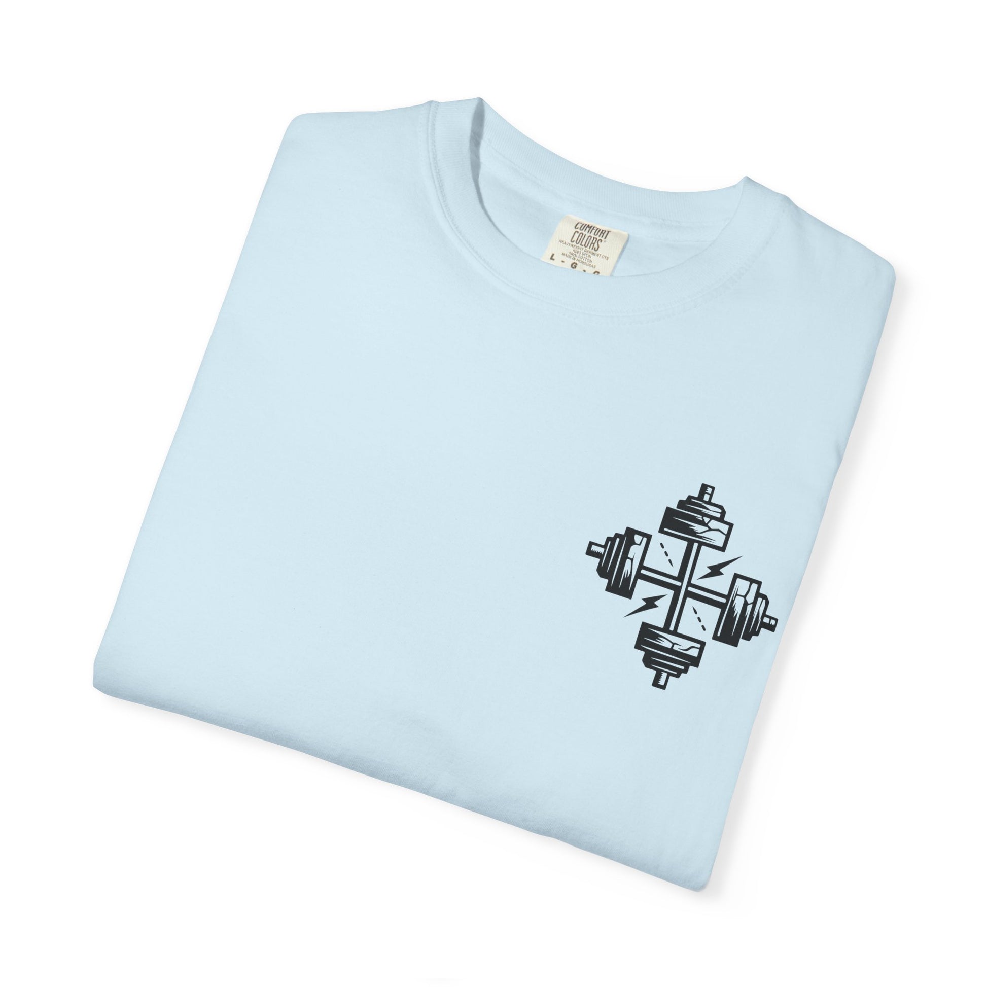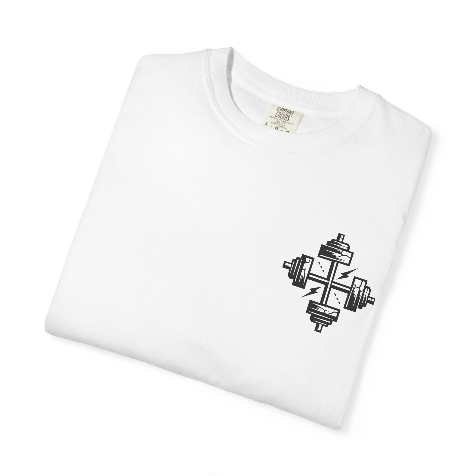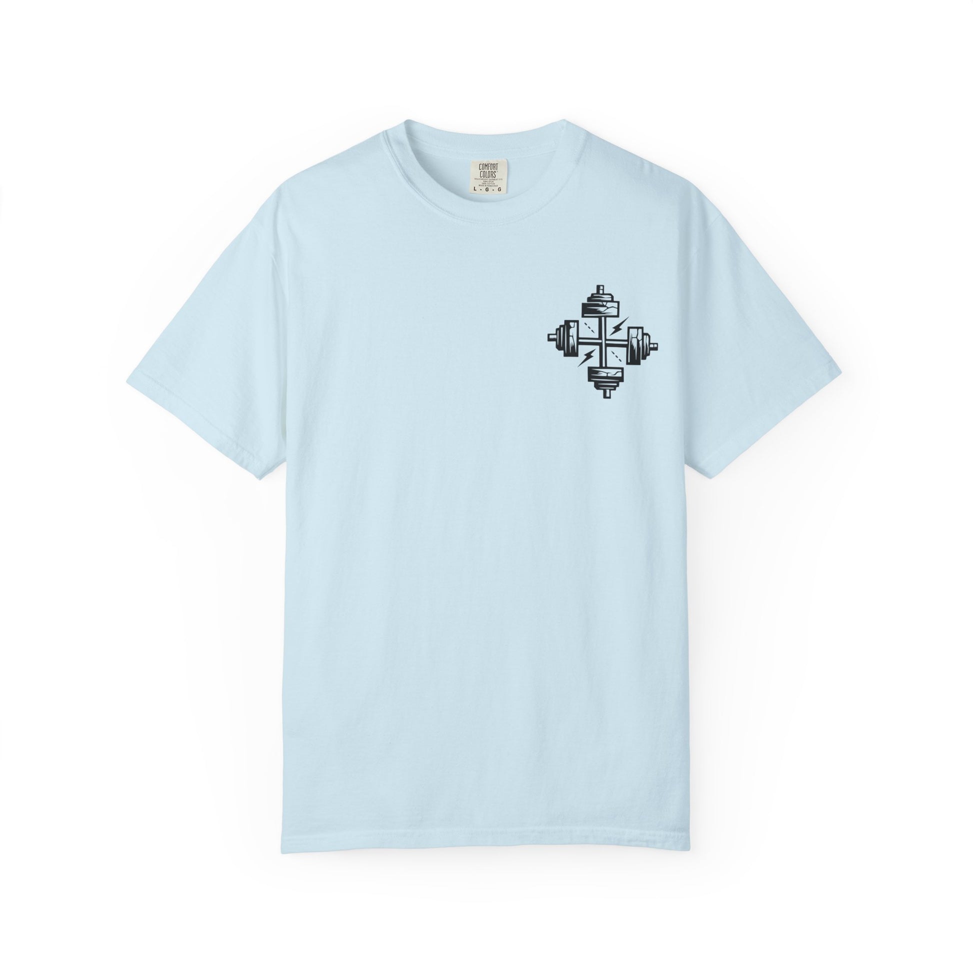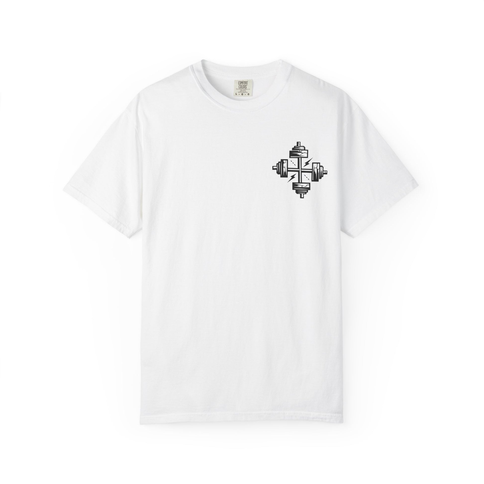 On the front, two intersecting dumbbells form a cross, symbolizing unwavering faith and dedication. Whether you're pushing through reps or walking in your calling, this tee boldly reflects the balance of physical discipline and spiritual devotion.