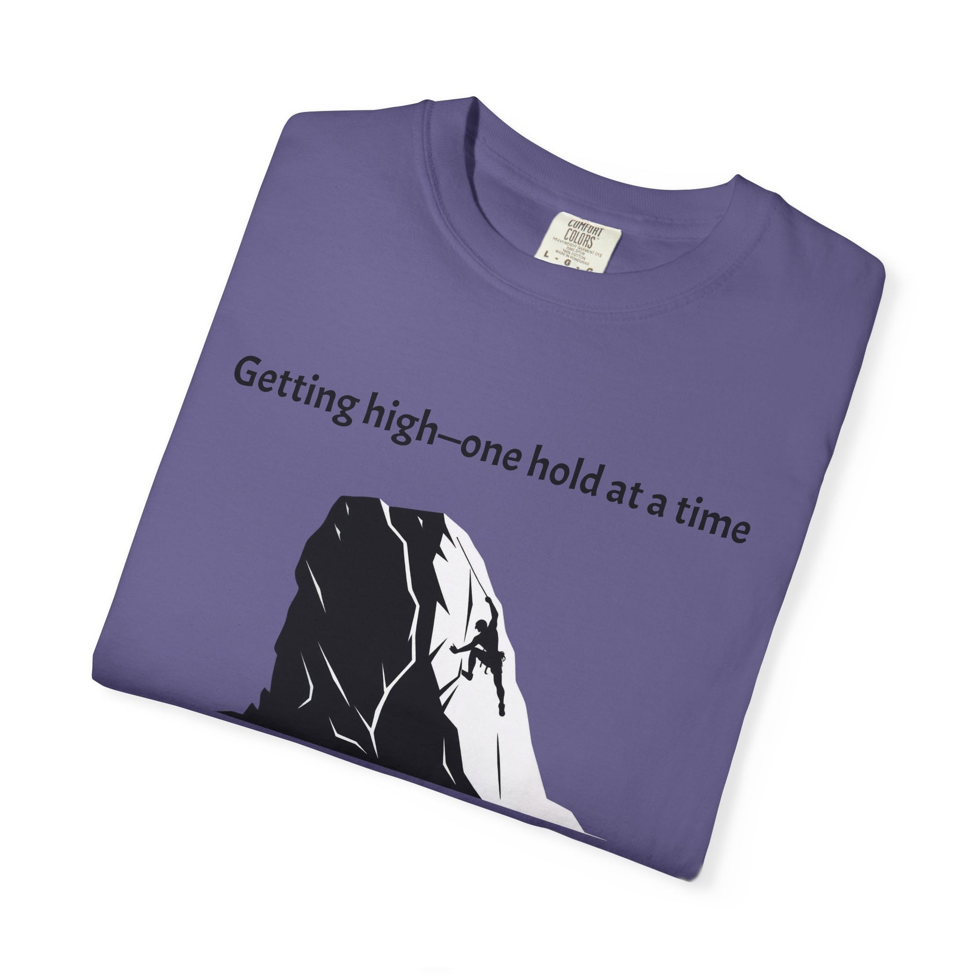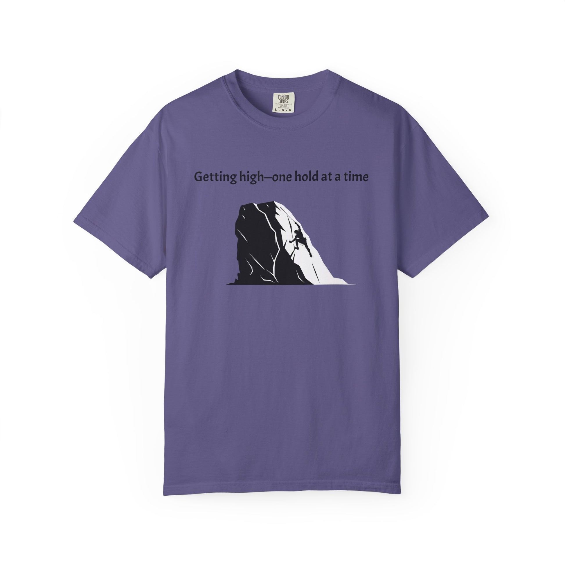 This one’s for the climbers who know that the best highs come with chalky hands and tight grips. Featuring the playful phrase "Getting High—One Hold at a Time," this shirt brings a clever edge to your climbing wardrobe—no substances required (unless you count adrenaline).